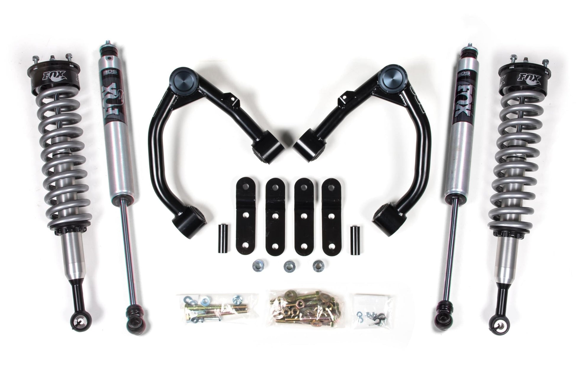 Up front the lift kit includes FOX 2.0 Performance Series coil-over shocks, heavy duty tubular upper control arms for increased strength, and 1 inchfront differential drop spacers to reduce CV angles. In the rear this kit utilizes 1 Inch Lift shackles to level the truck and a matching set of FOX 2.0 Performance shocks for the smoothest ride.